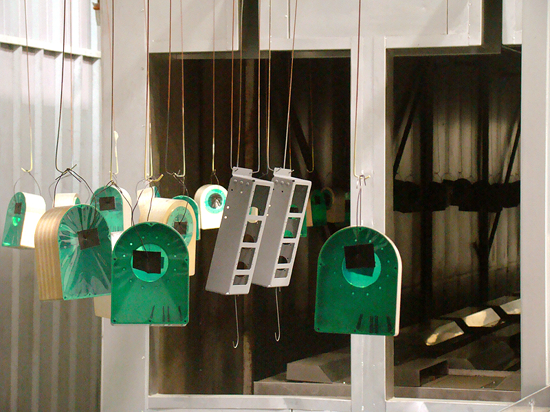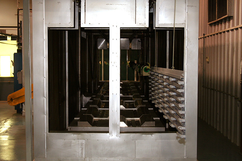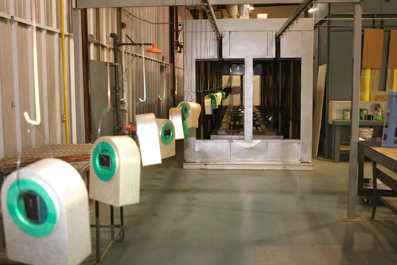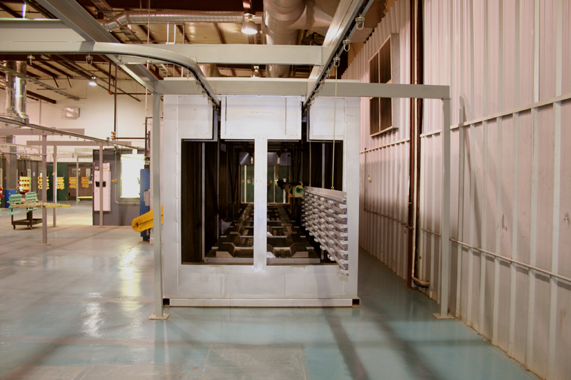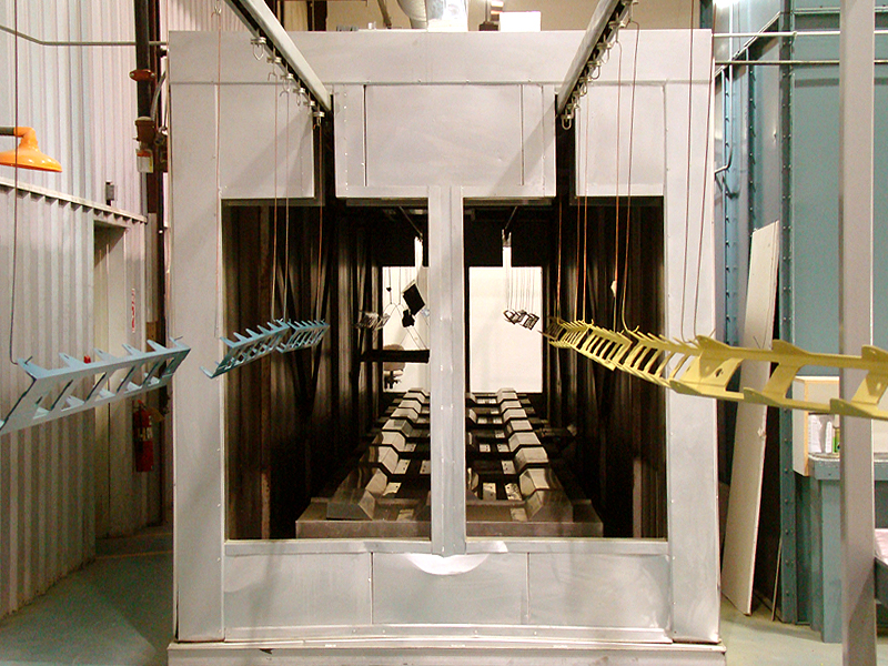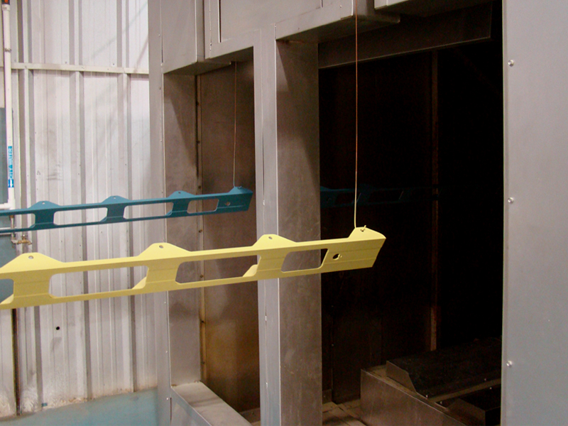 After prime or paint parts leave the paint booths traveling toward the 45 ft long dry oven. The travel time from the paint booth to the dry oven allows the parts 15 minutes flash time prior to entering the oven.